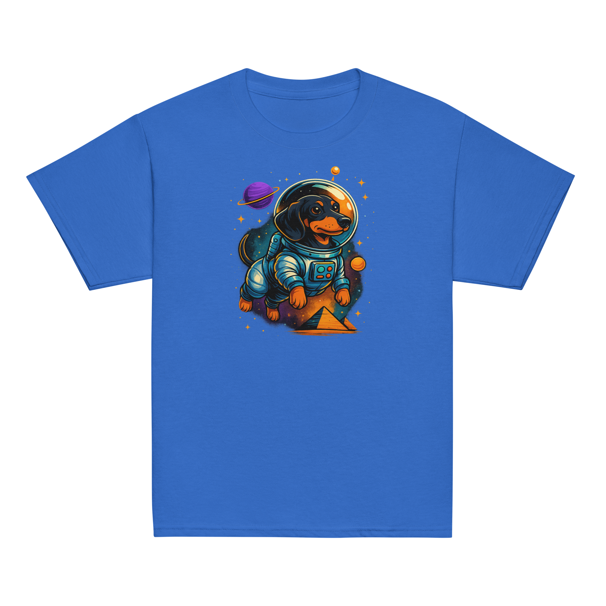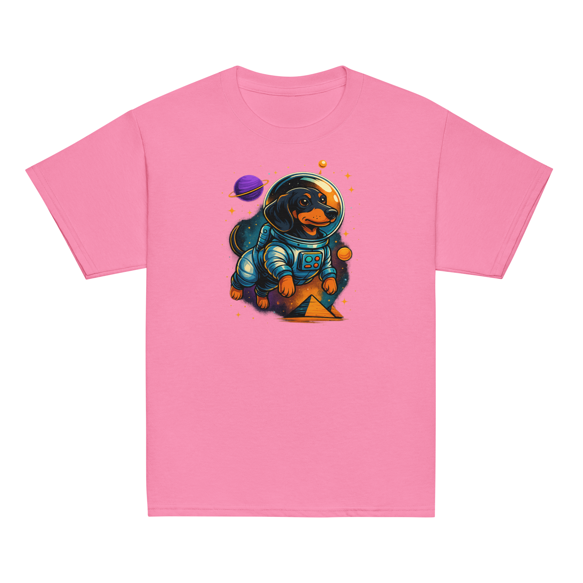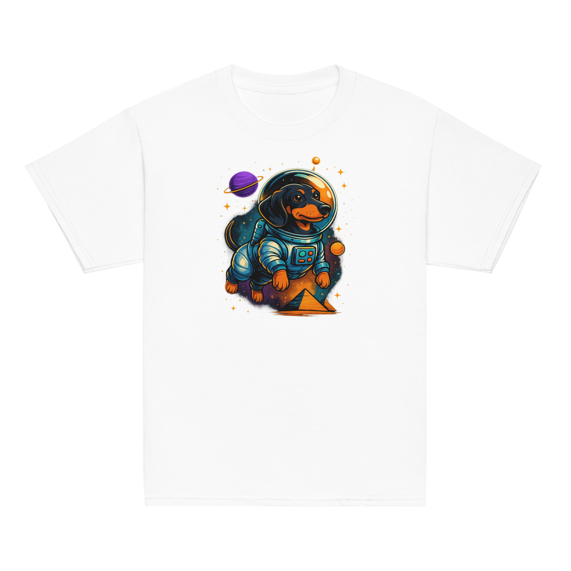 Fronted by a fearless astronaut pup exploring galaxies, backed by glowing planets and pyramids from another world—this tee is a ticket to space-fueled imagination. It’s bold, bright, and built for explorers who color outside the lines.