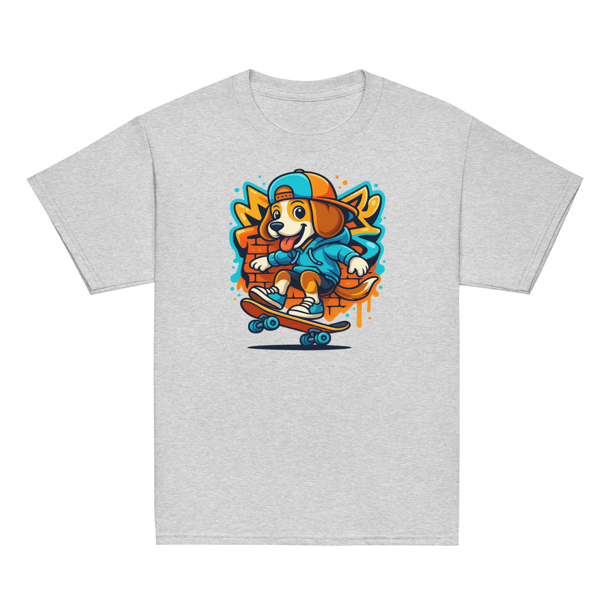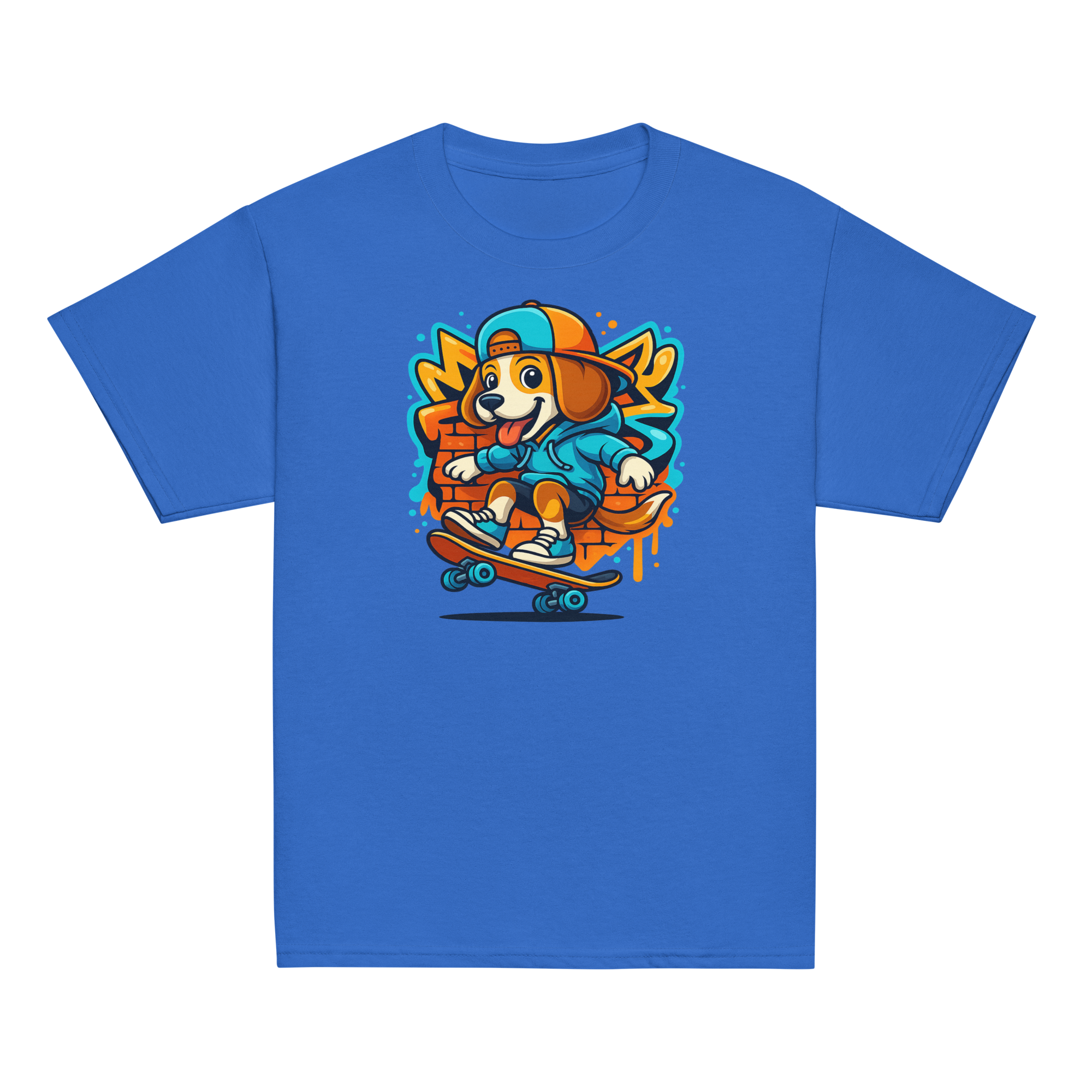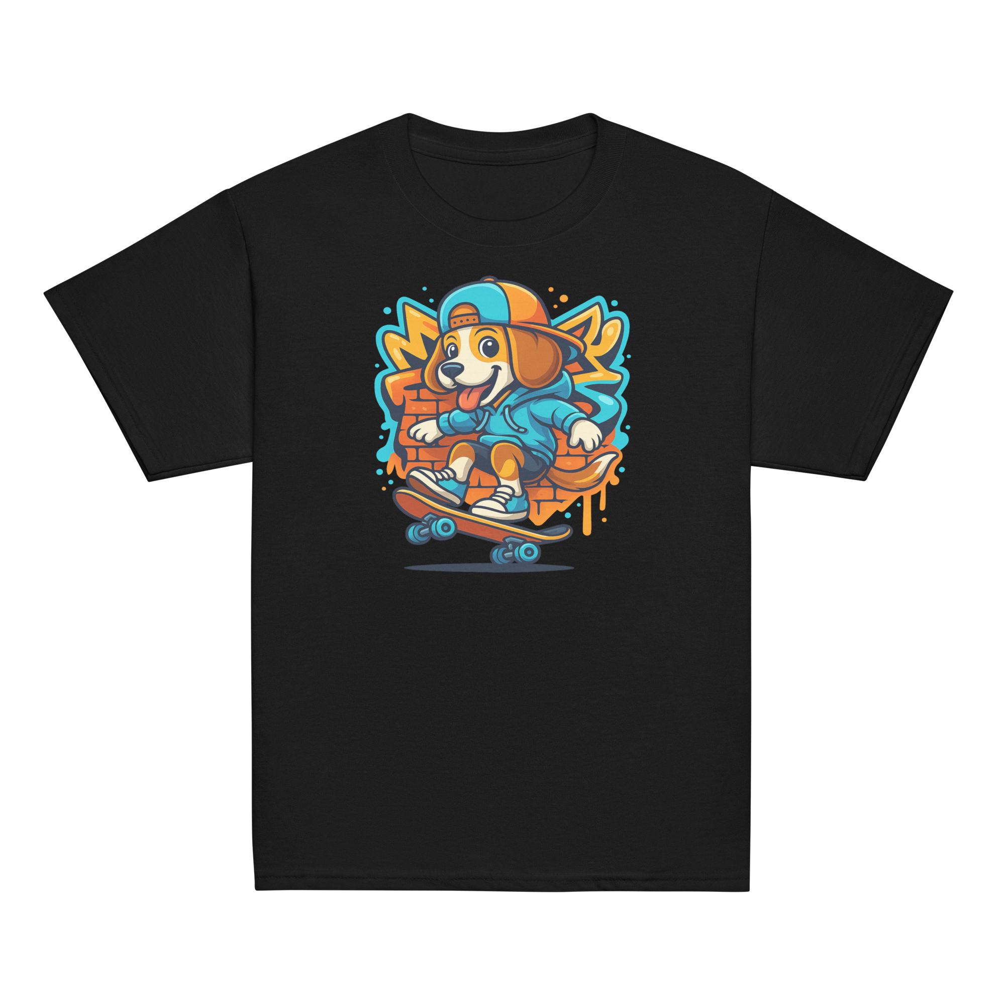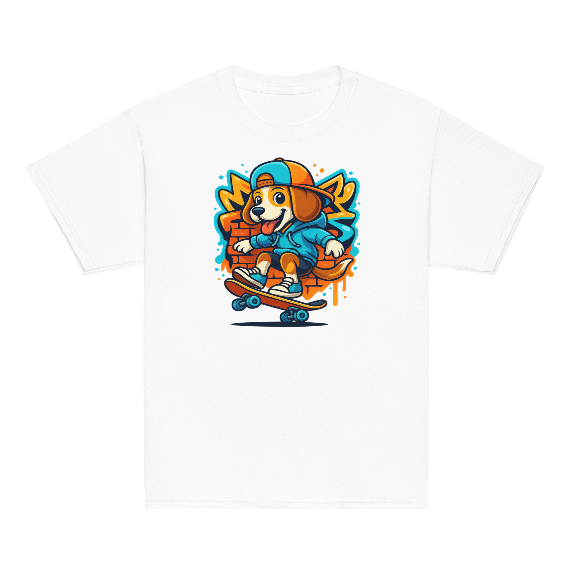 Fronted by a fearless beagle mid-ride, backed by bold lines and street energy, this tee screams movement and mischief. It’s built for kids who turn sidewalks into skateparks and every day into an adventure.