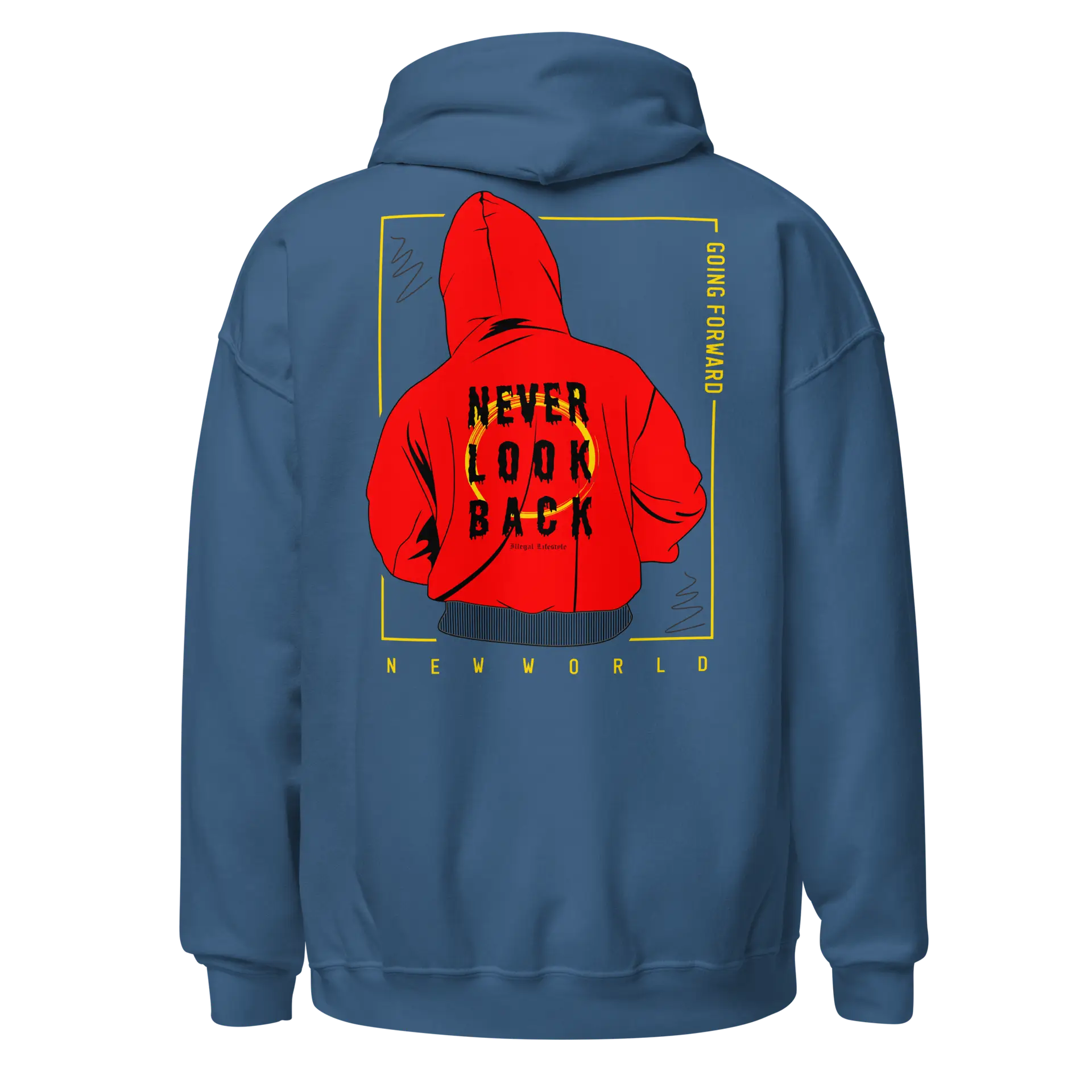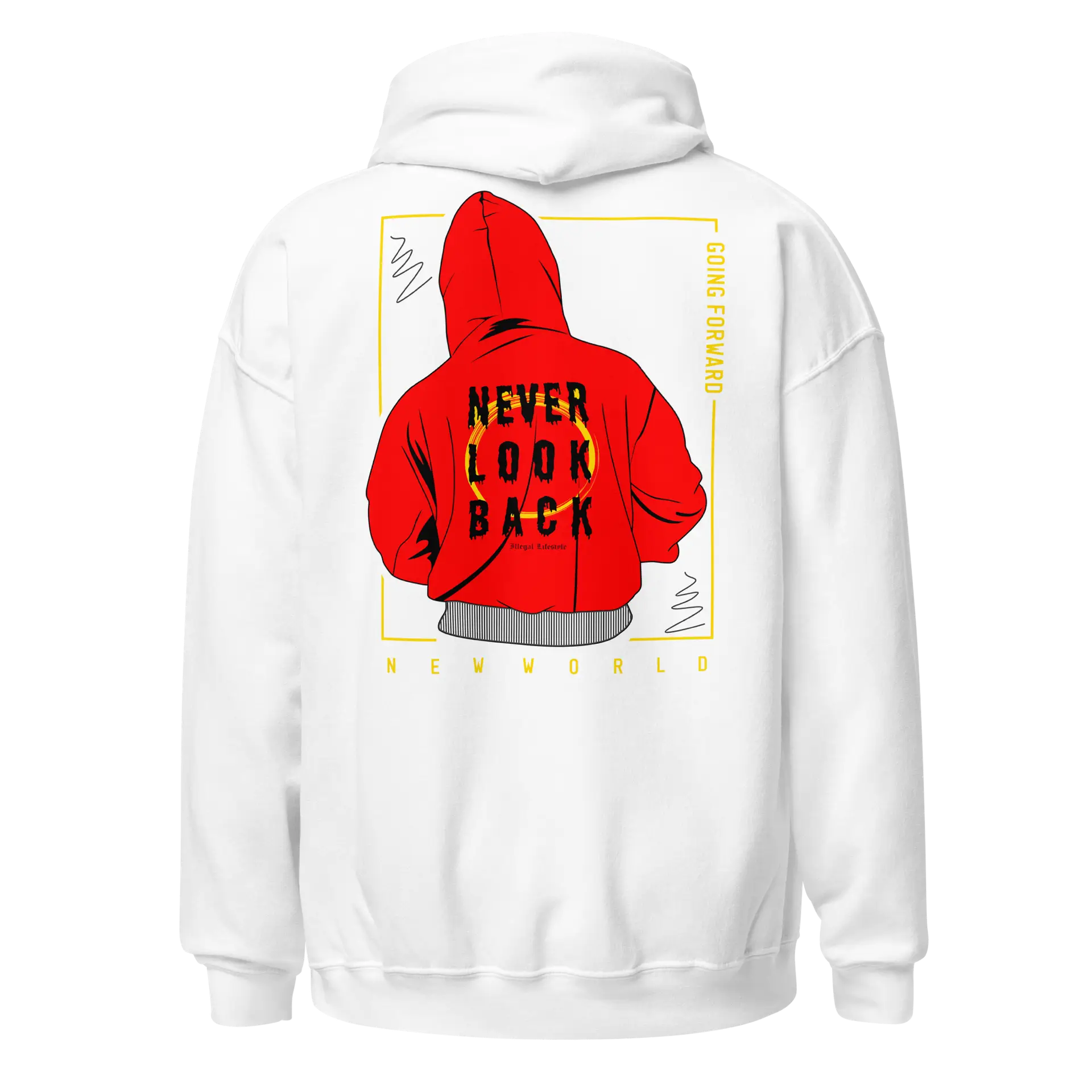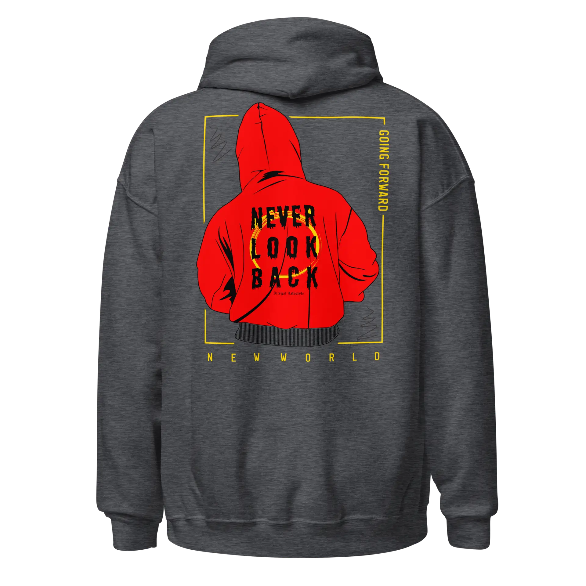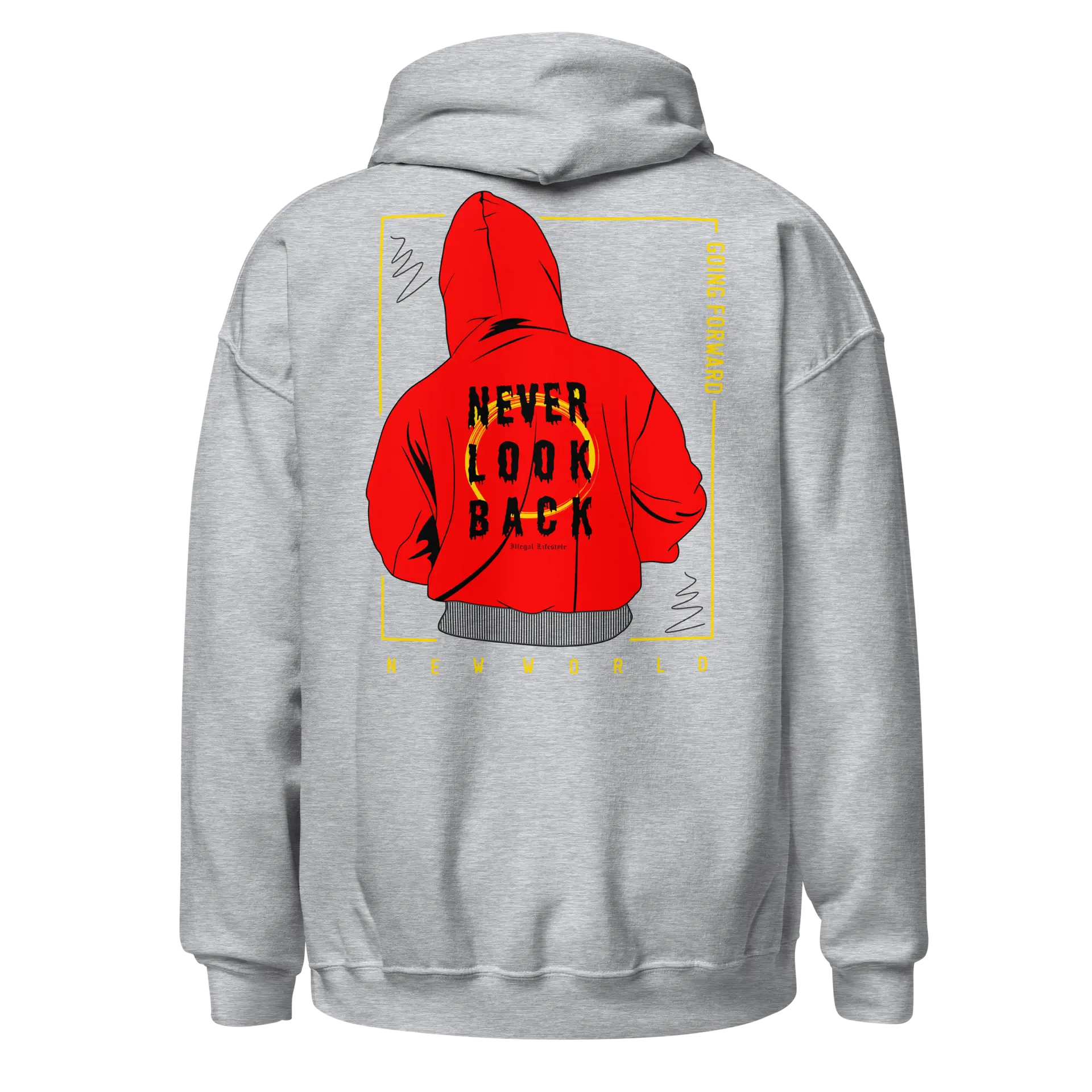 On the front, a fiery red logo sets the tone. But turn around, and the message becomes unmistakable: “Never Look Back” blazes boldly in yellow across a vivid red hoodie silhouette. This isn’t just a graphic—it’s a declaration of drive and determination.