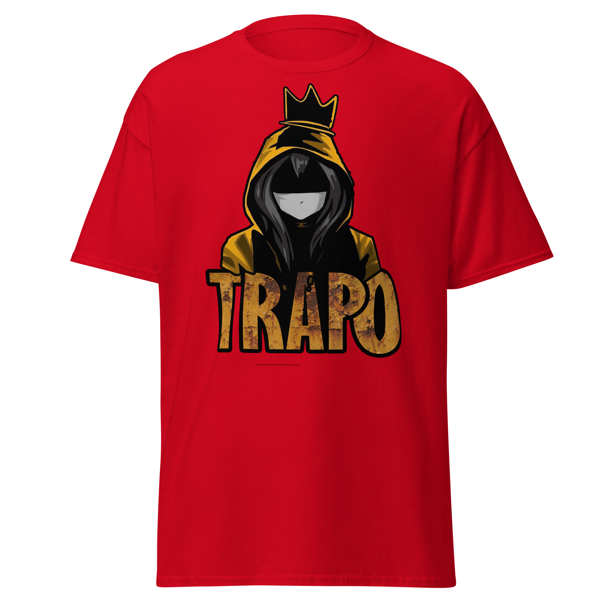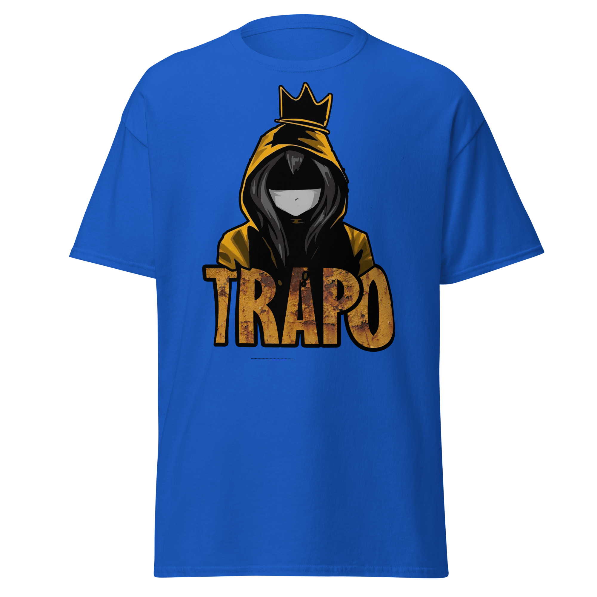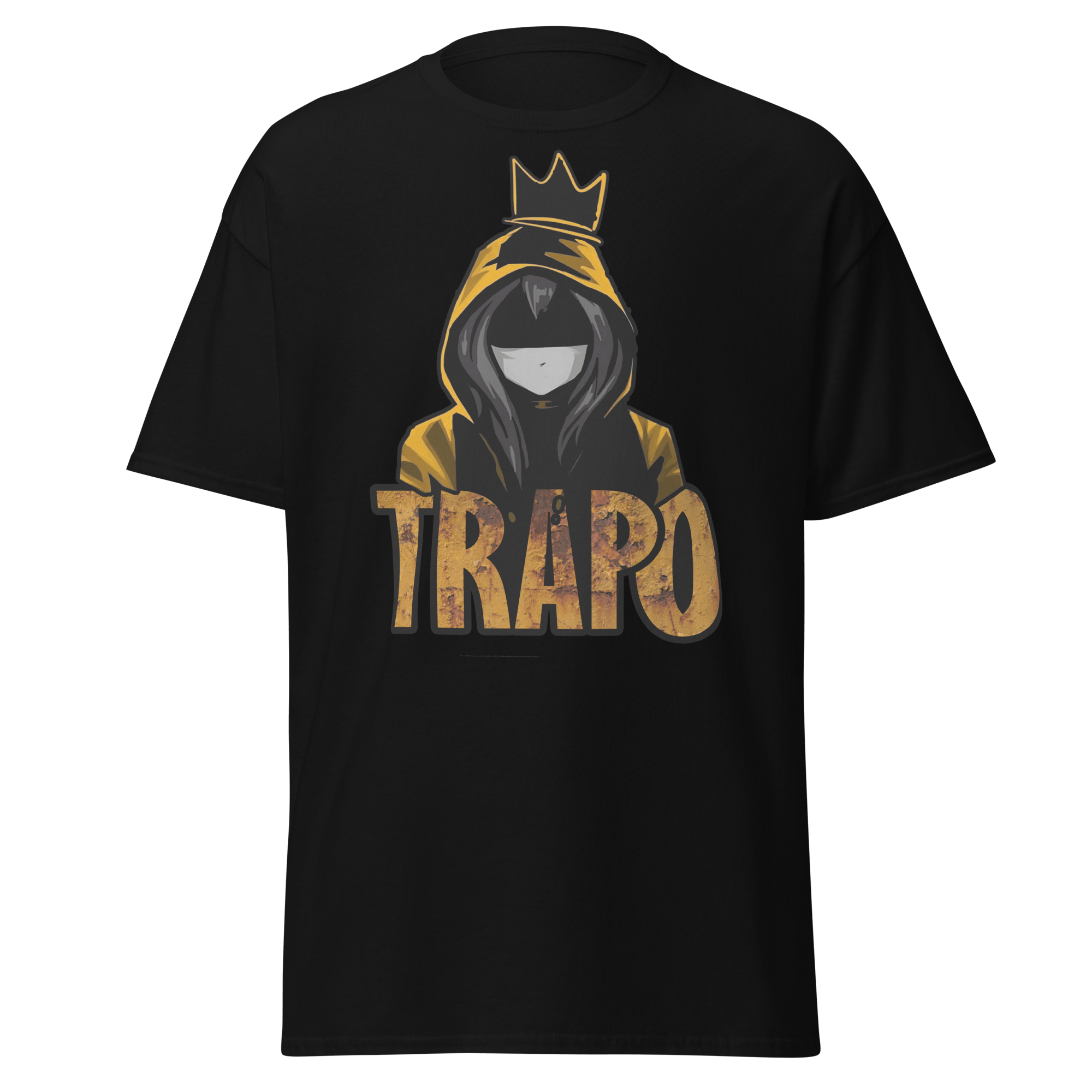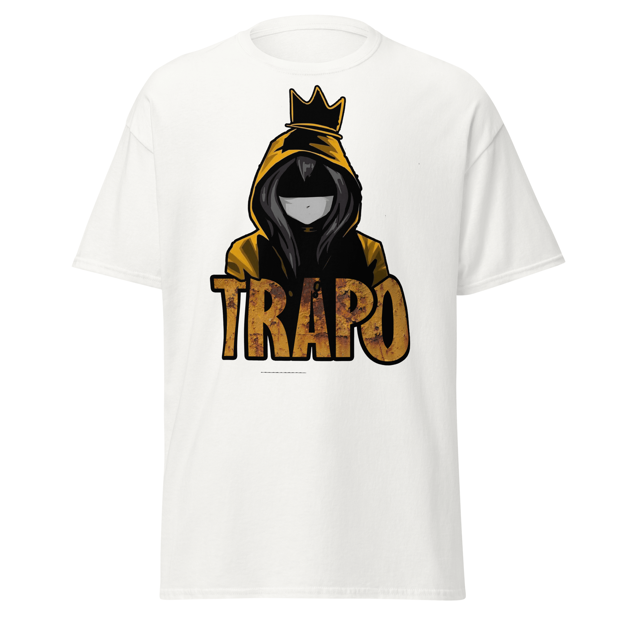 The crisp white background sets the stage for high-contrast artwork in gold and black, making the print pop from across the room. The distressed “TRAPO” typography adds a rugged, worn-in edge — perfect for those who’ve earned their crown. The hooded character remains faceless, leaving room for your own identity to shine through. It’s expressive, artistic, and loaded with presence.