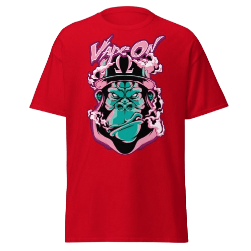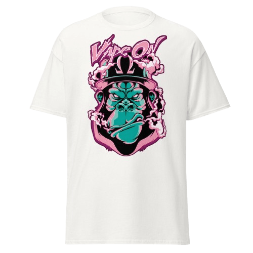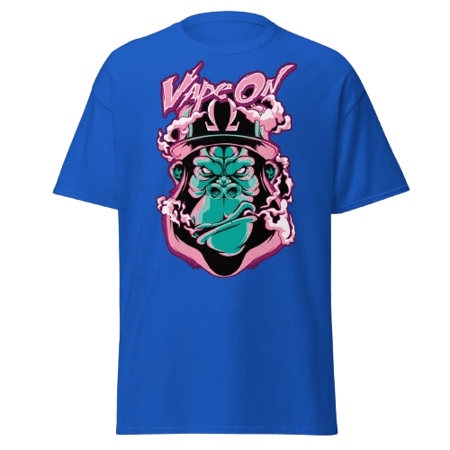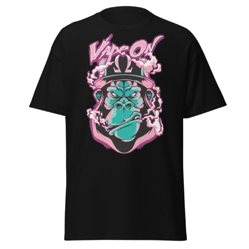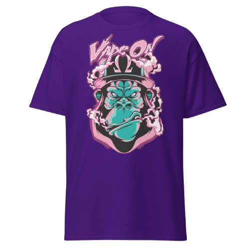 Make a bold statement with the “Vape On” Gorilla Graphic T-Shirt. This striking design features a stylised gorilla in teal and pink, blowing clouds of vapour in true street-style fashion. Set against a rich purple backdrop, it’s a vibrant piece for vape culture fans, urban art lovers, and anyone who thrives on standing out.