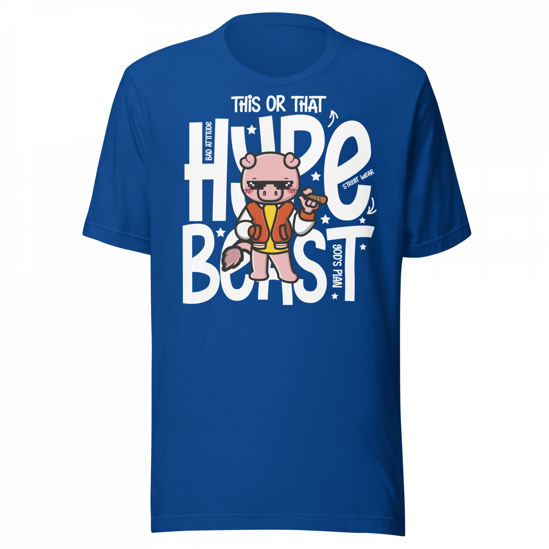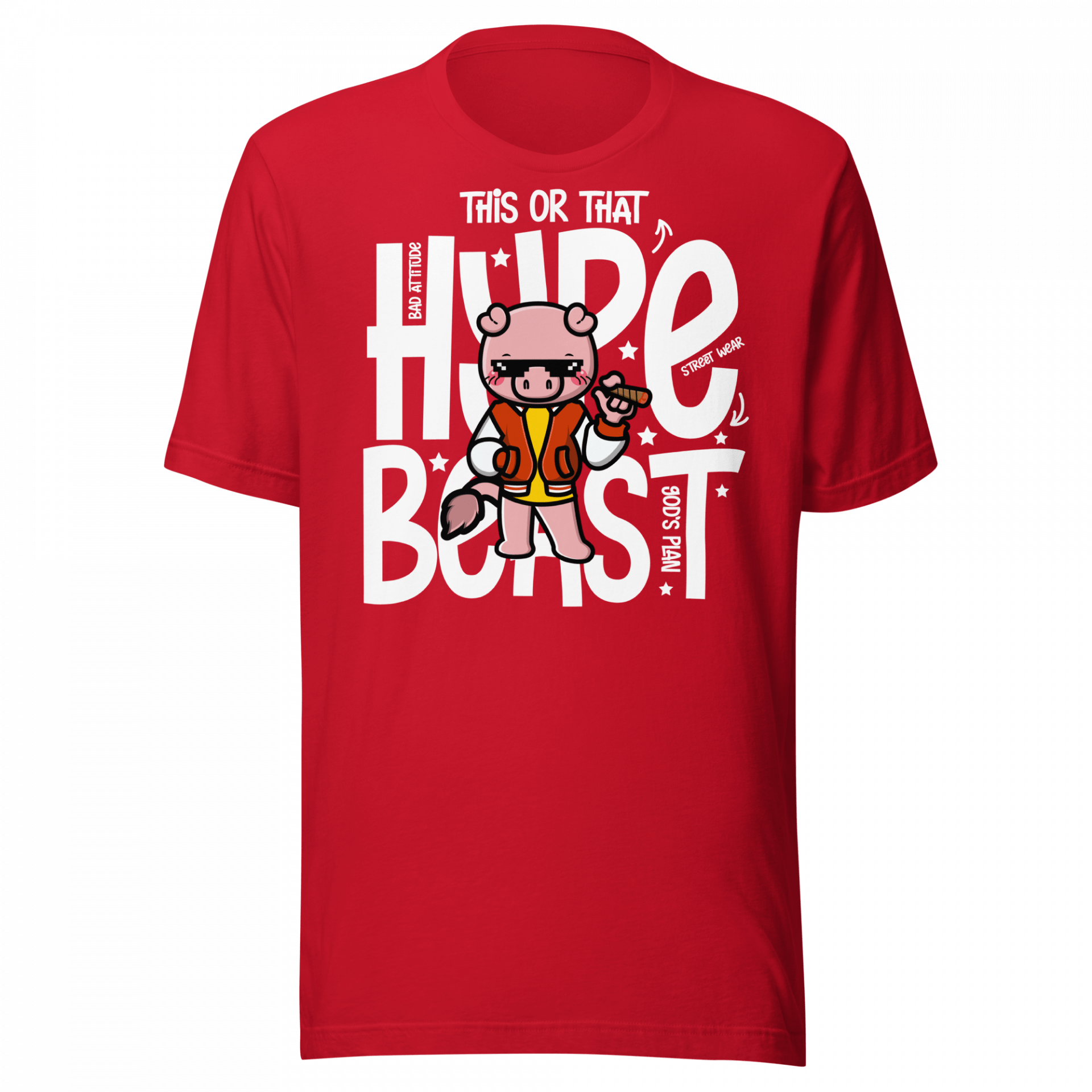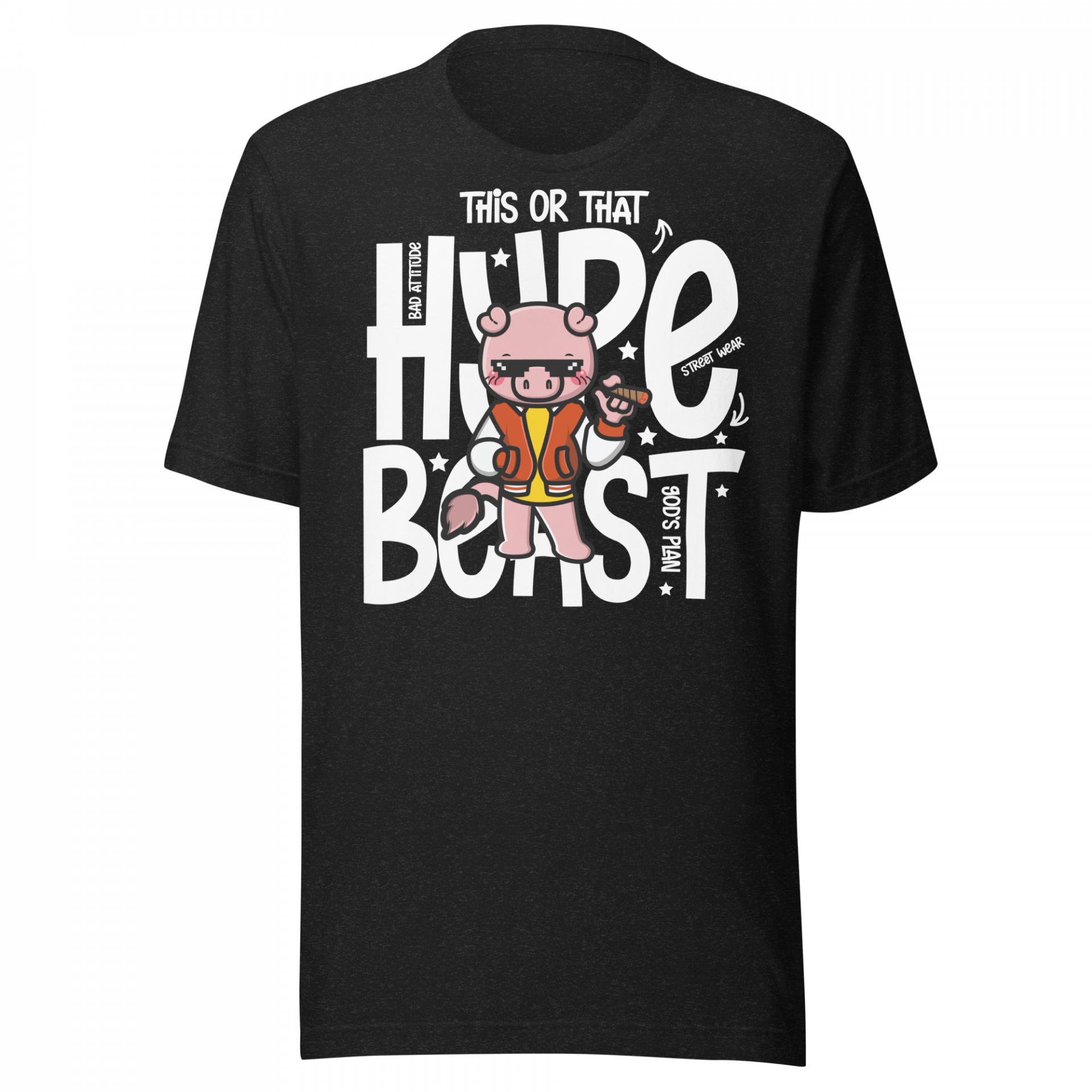 Add a playful twist to your wardrobe with the Hype Beast T-Shirt. This quirky design features a street-savvy pig dressed in full hypebeast style, surrounded by bold phrases like “Bad Attitude,” “God’s Plan,” and “Street Wear”. It’s a perfect fit for anime fans, sneaker lovers, and anyone who enjoys fashion with a sense of humour.
